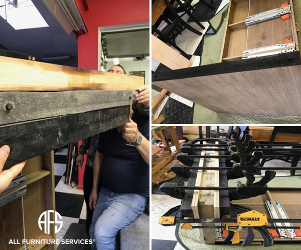 Desk Table Leg water damage expanded warped wood repair restoration leveling press veneer and compress wood fix ← Previous Next →